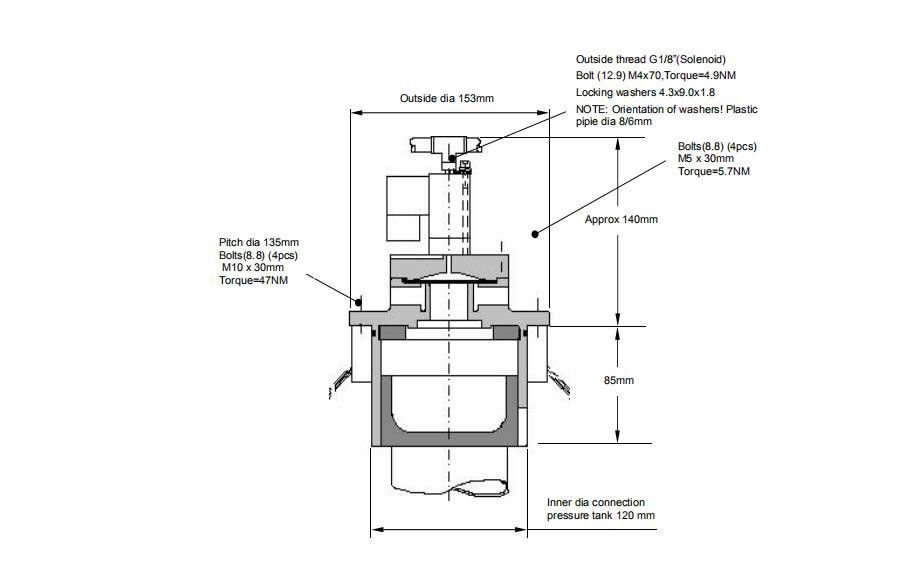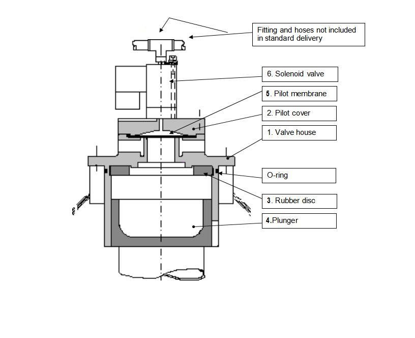 Place the piston (item 4) in the upper part of the impulse tube. Lubricate the O-ring on the outside of the valve body (item 1) and align the house with the plunger. When installing the pulse valve, be careful not to damage the O-ring. Rotate the house so that the solenoid faces the desired direction. Tighten the four bolts with your fingers as long as possible, then make the final adjustment with a cross-shaped tool to avoid damaging the O-ring. Torque to specifications.