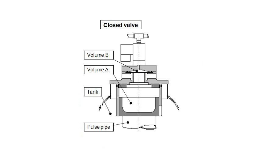 Volume A is connected to the pressure tank through a gap between the valve body and the plunger. Volume A has the same pressure as the pressure tank.